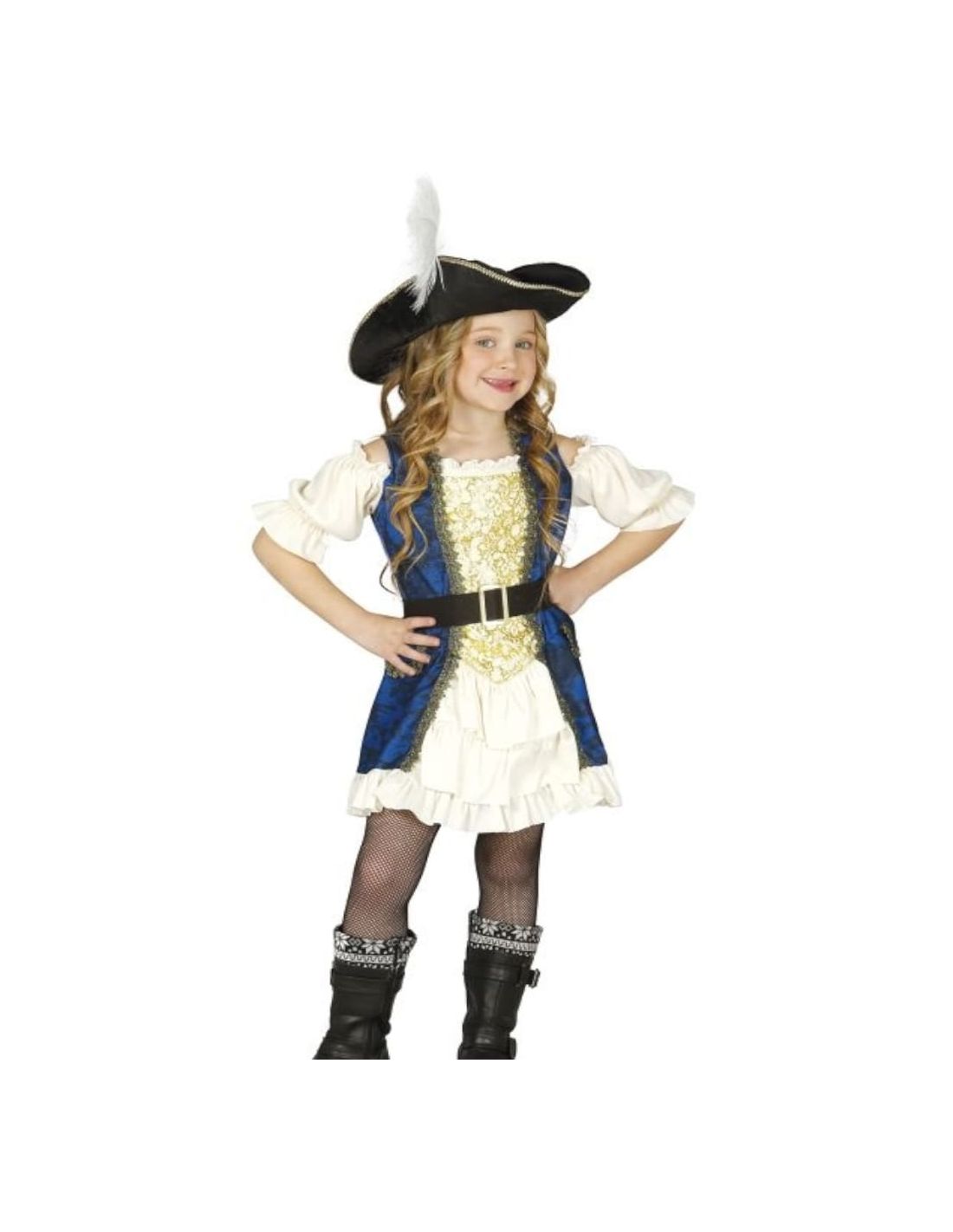 Disfraz de capitana pirata para niña. Incluye vestido con detalles, sombrero y cinturón.
