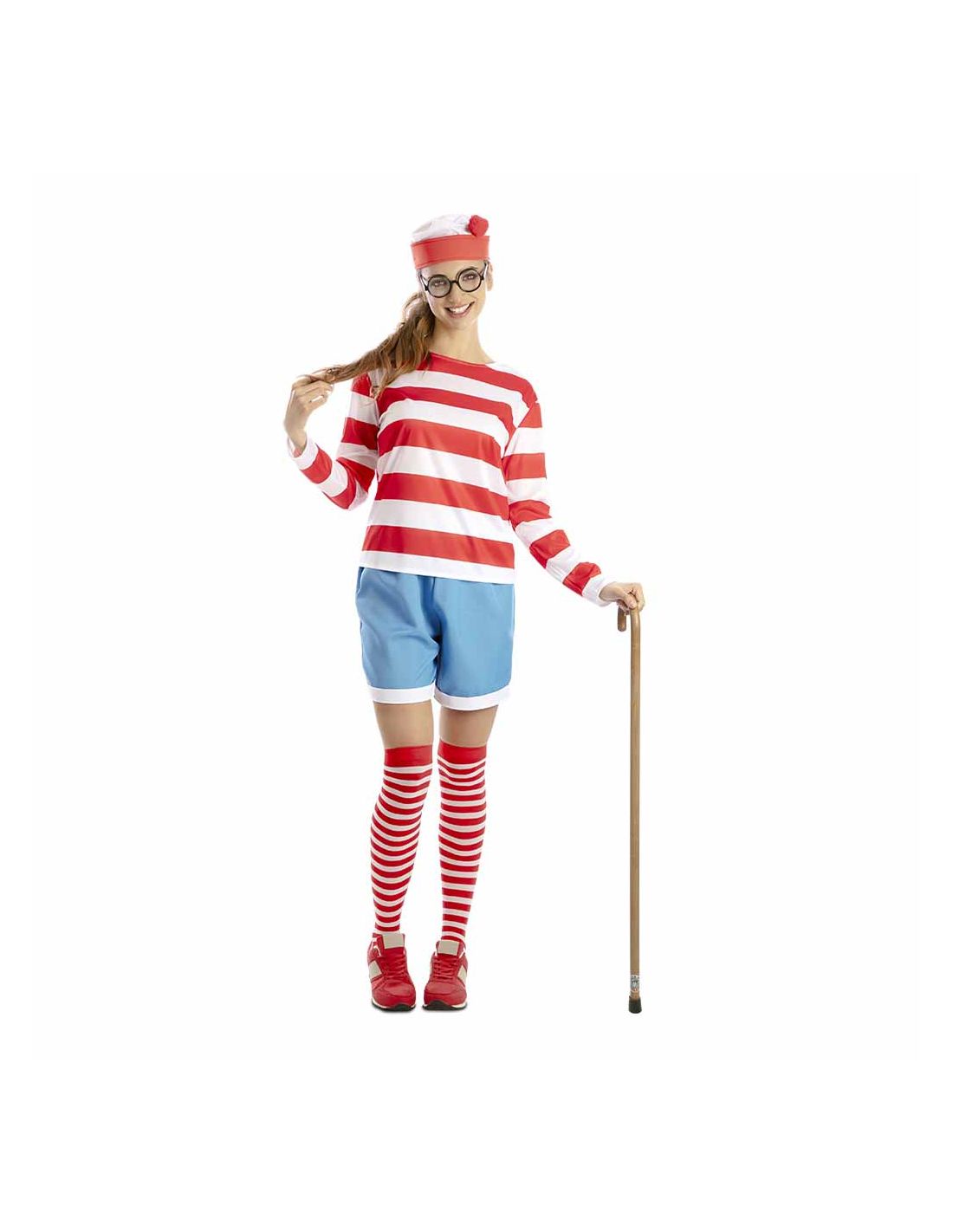 Disponible en distintas tallas, este disfraz incluye pantalón, camiseta, gorro y medias, ofreciendo un look completo y coherente sin necesidad de complementos adicionales.