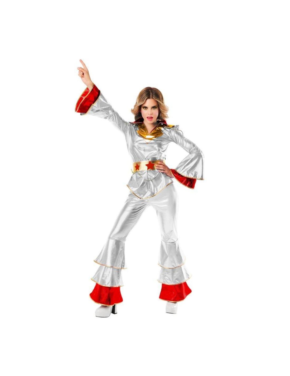 Disfraz de cantante disco plata para mujer, inspirado en el estilo musical de los años 70.